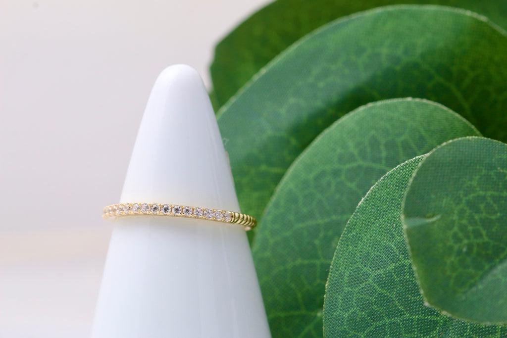 This thin eternity band is studded with cubic zirconias. It is half cz and half twist band. Available in sterling silver or gold vermeil. Sizes 5-9