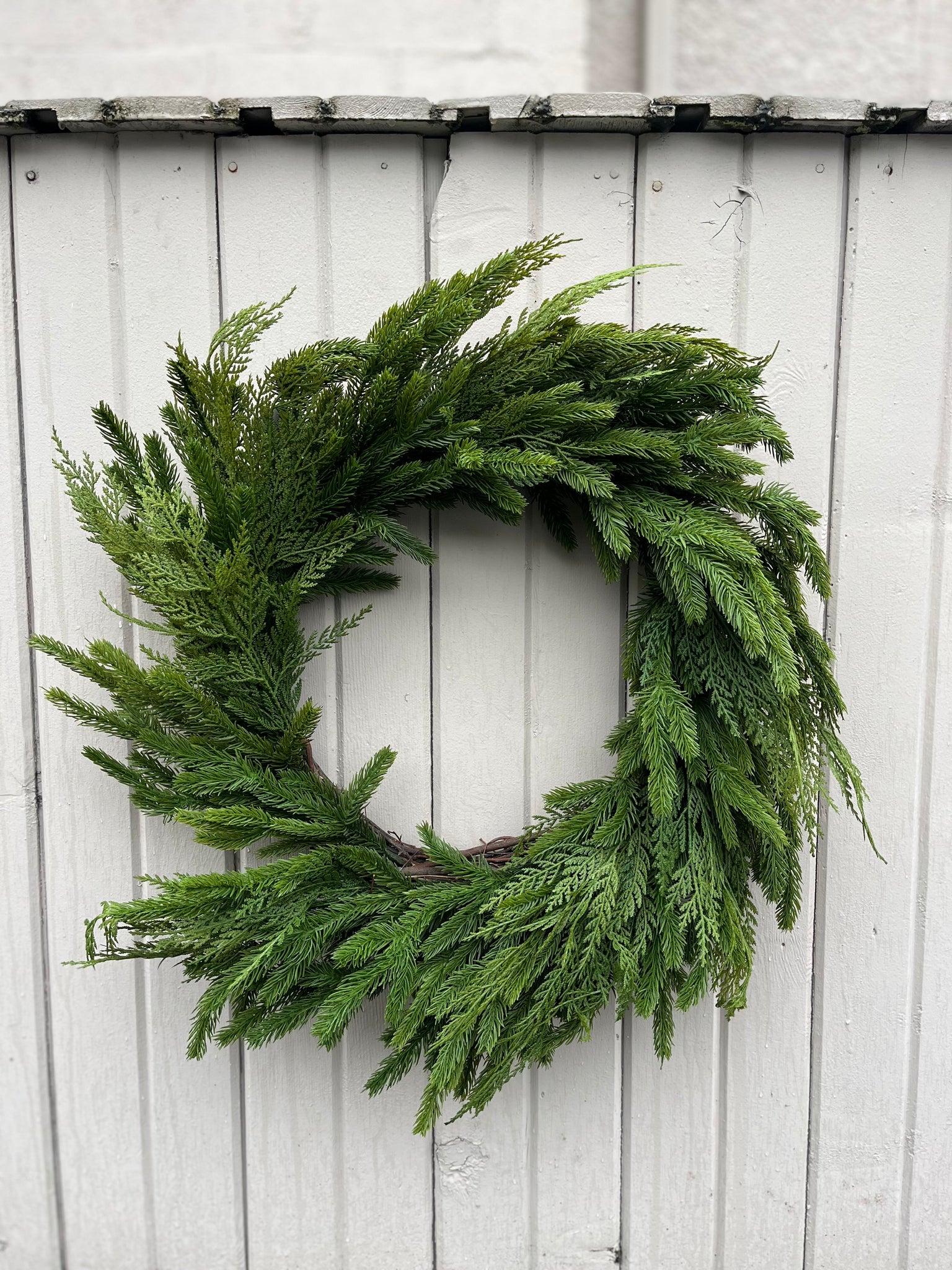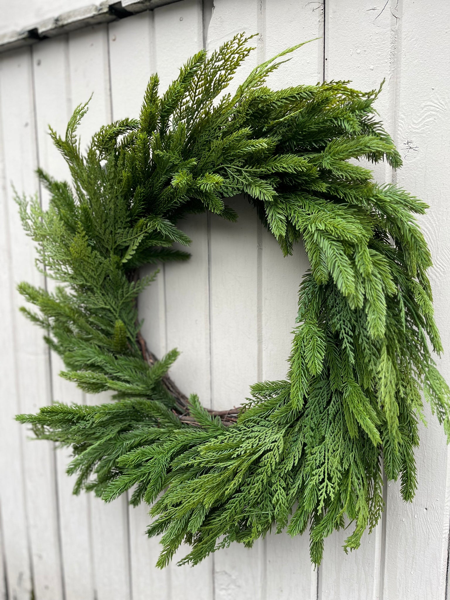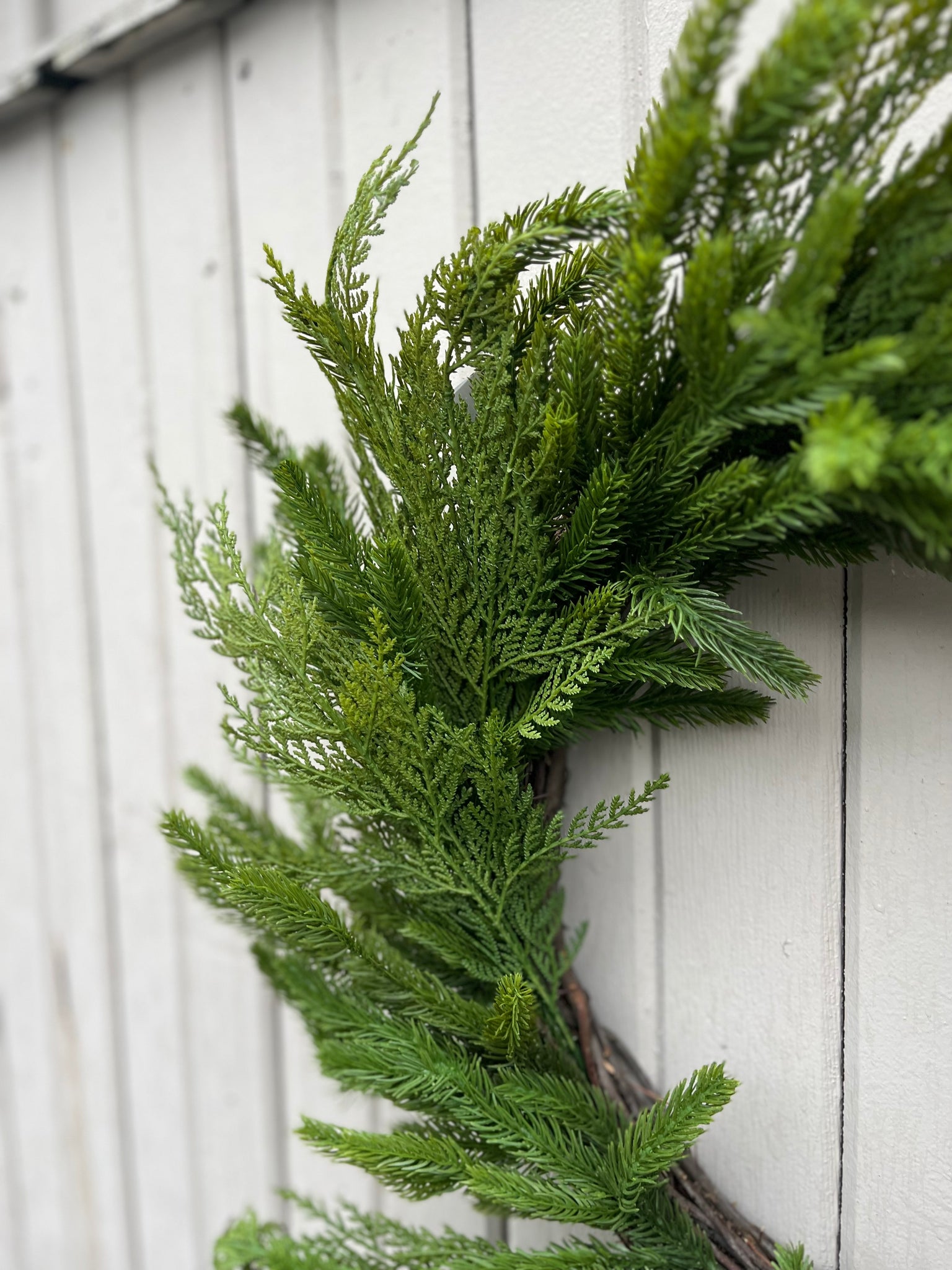 Spruce up your home this winter season with our fresh touch greenery! This Fresh Touch Spruce & Cedar Wreath adds an organic, wintery look to your space. Makes an impact on your front door!