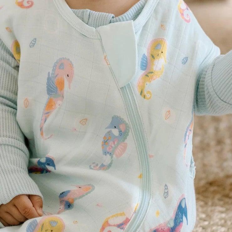 Made with soft, breathable muslin fabric, it features a 2-way zipper that opens all the way around the bottom for easy diaper changing and a sleeveless design that’s perfect for the late spring and summer months.