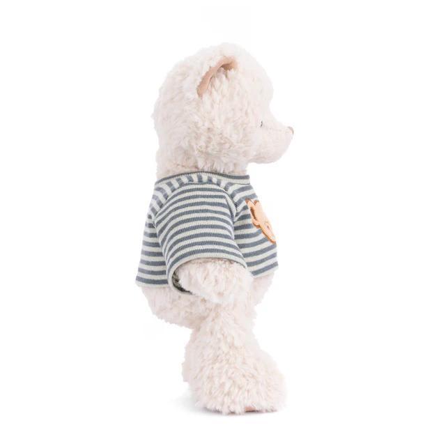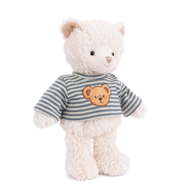 Jonas is a cuddly plush bear with soft cream-colored fur and a friendly stitched face. He wears a blue-and-white striped shirt featuring an embroidered bear face for a playful touch. With his classic design and huggable feel, Jonas is a delightful companion for snuggles, play, or display.