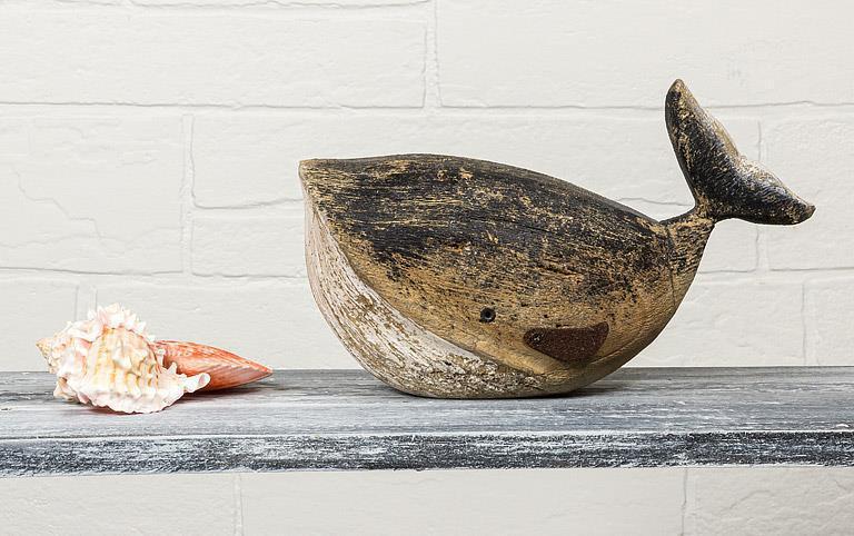 A beautiful, weathered wooden whale that will look perfect within your chic and coastal home.