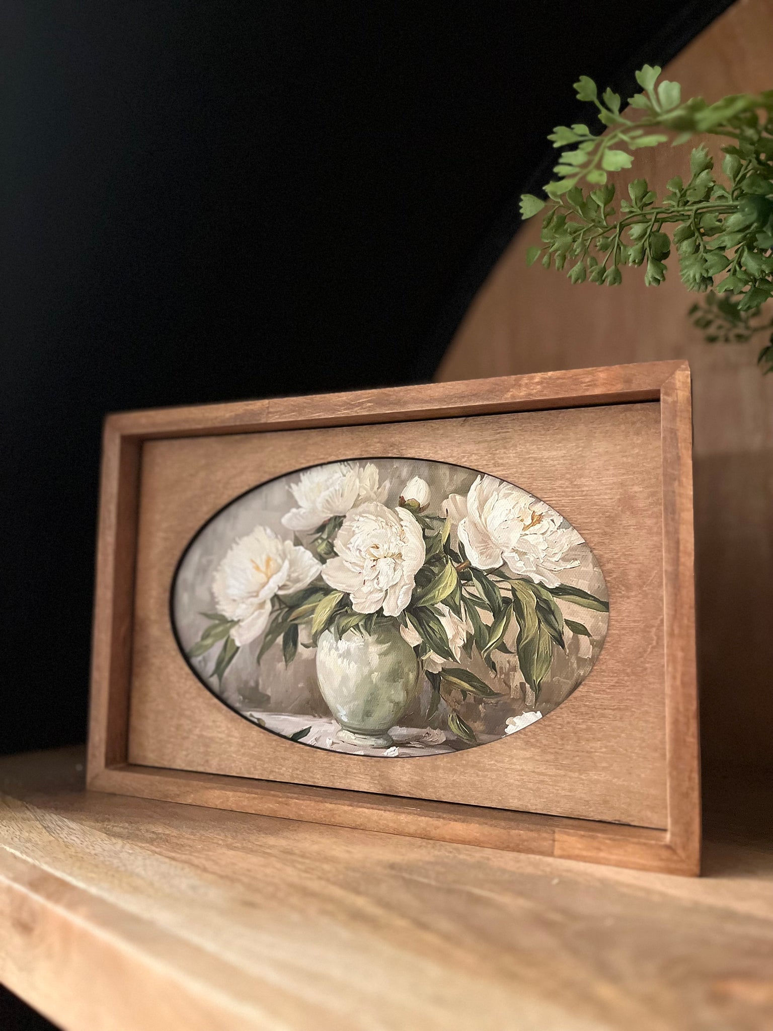 This framed art piece measures 12x8 inches. The 1" deep solid wood frame allows it to stand on it's own on a shelf or tabletop. The laser cut wood mat has an oval opening that gives this piece a vintage look. The artwork is printed on to high quality textured canvas using vibrant Canon pigment inks that will last a lifetime. All wood pieces are stained in a beautiful Early American wood tone. This piece is printed and hand crafted in Twin Falls, Idaho.