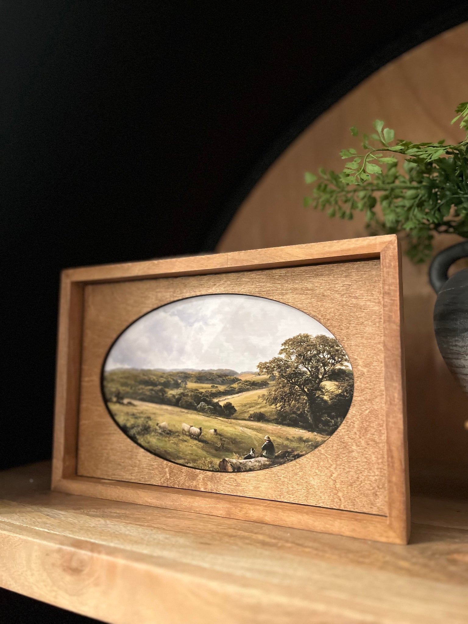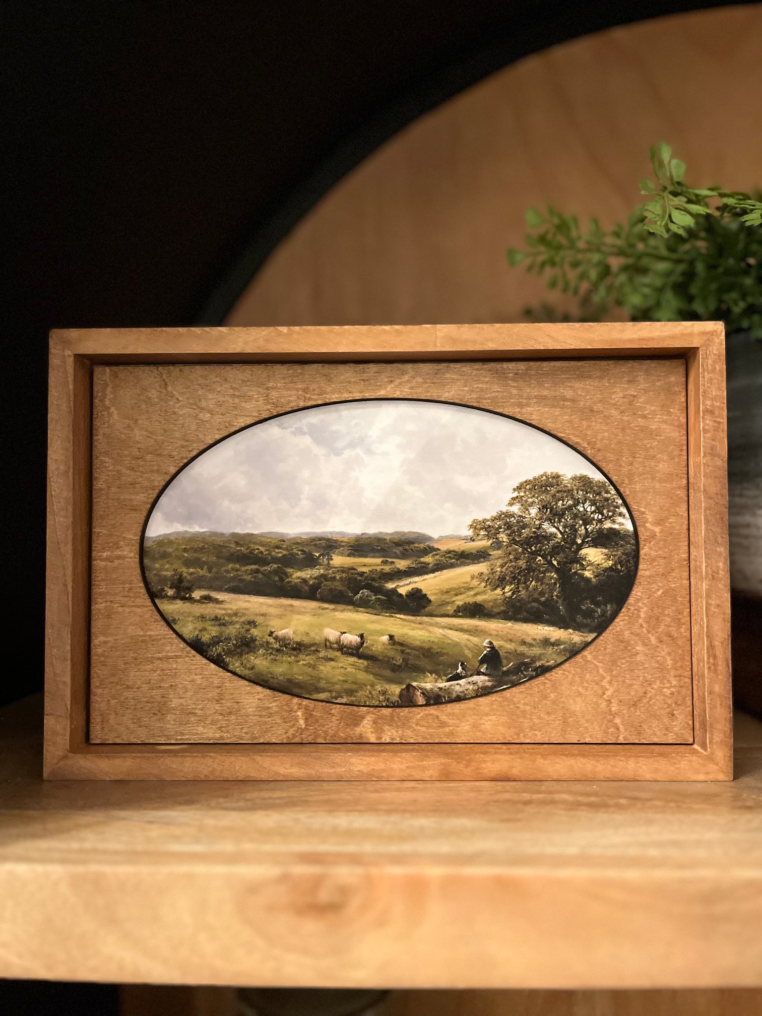 This framed art piece measures 12x8 inches. The 1" deep solid wood frame allows it to stand on it's own on a shelf or tabletop. The laser cut wood mat has an oval opening that gives this piece a vintage look. The artwork is printed on to high quality textured canvas using vibrant Canon pigment inks that will last a lifetime. All wood pieces are stained in a beautiful Early American wood tone. This piece is printed and hand crafted in Twin Falls, Idaho.