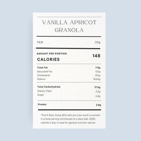 Organic Gluten Free Sprouted Oats, Oragnic Puffed Amaranth, Organic Coconut Oil, Organic Coconut Sugar, Organic Maple Syrup, Organic Oat Flour, Organic Chia Seeds, Organic Vanilla Bean Paste, Flaky Salt, Dried Apricots.