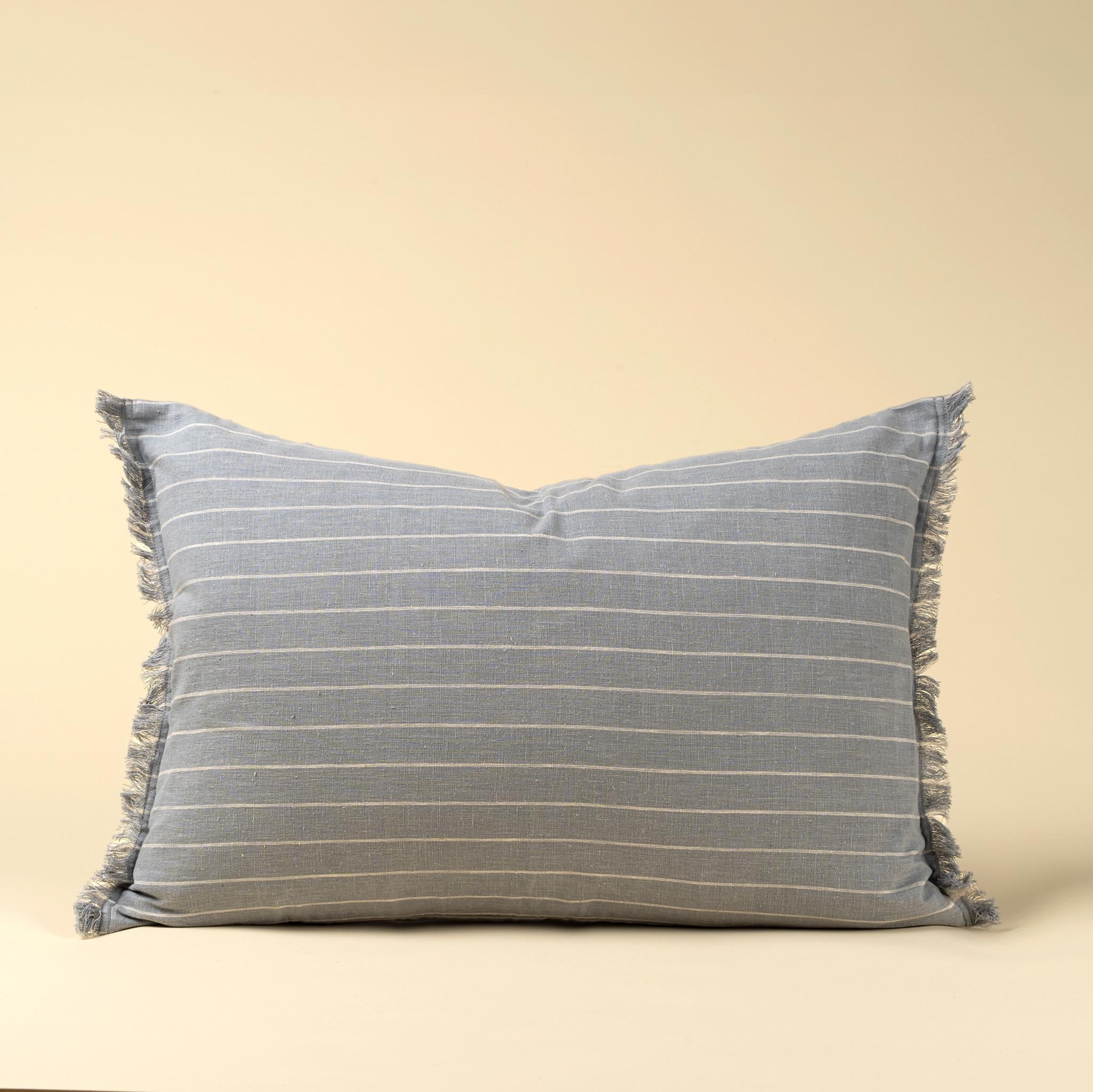 Bring a refined, relaxed feel to your space with the Handloom Stripe Pillow in slate blue. This decorative pillow is hand loomed in India, featuring subtle white stripes and soft fringe on the shorter ends. Its soothing soft blue hue and artisanal texture make it a standout among throw pillows for couches, adding just the right touch of character and comfort.
