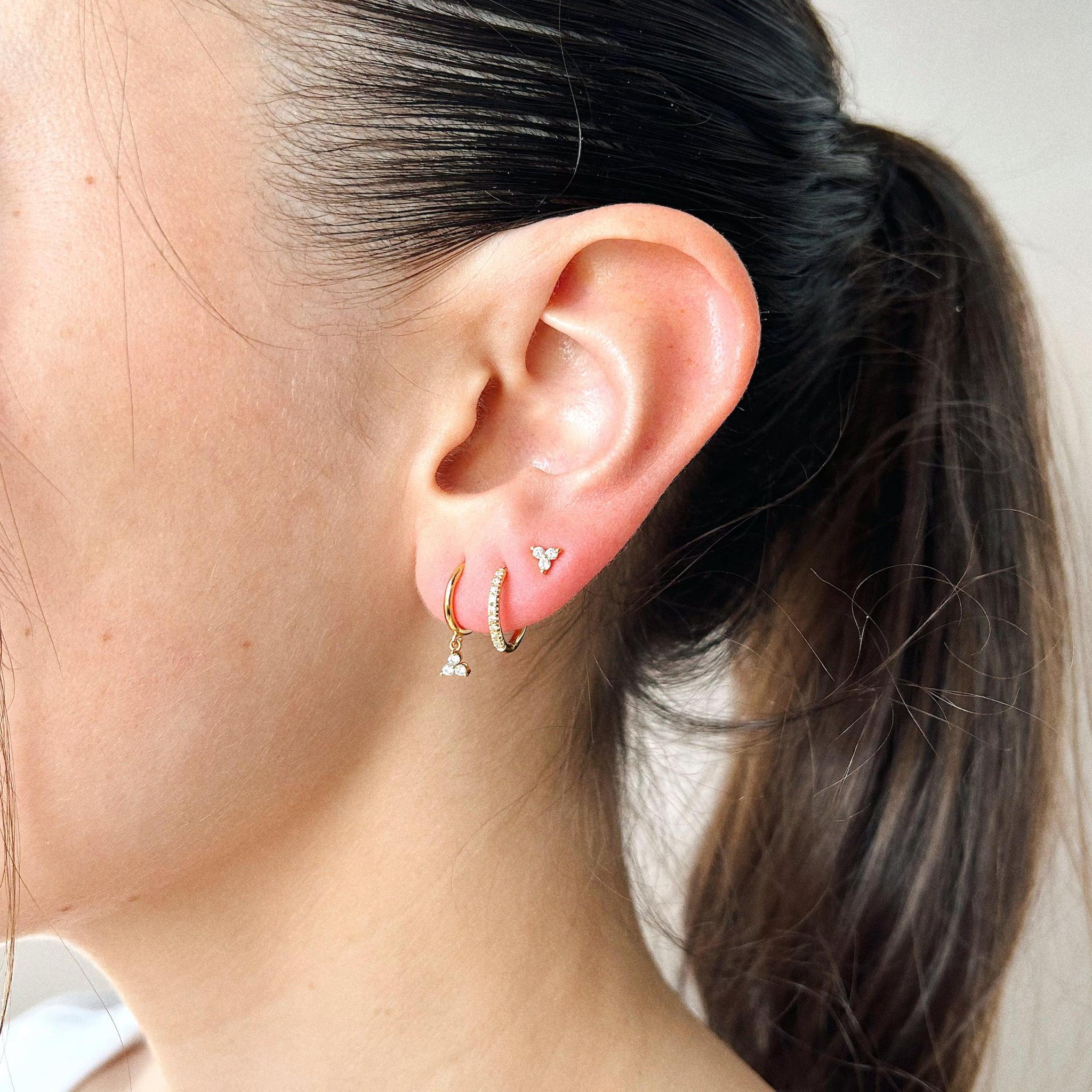 Small stud type earrings adorned with three white zircons forming a small triangle. Can be worn in the first, second or third lobe piercing holes. Versatile, they will go with all styles.