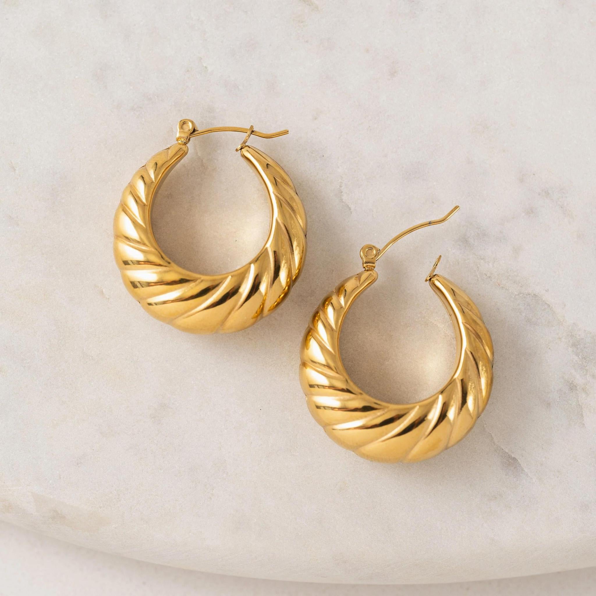 With a textured shine and glamorous silhouette, the Josie Hoop is sure to become your go-to style statement. Made with PVD and stainless steel, you can wear these waterproof earrings anywhere.