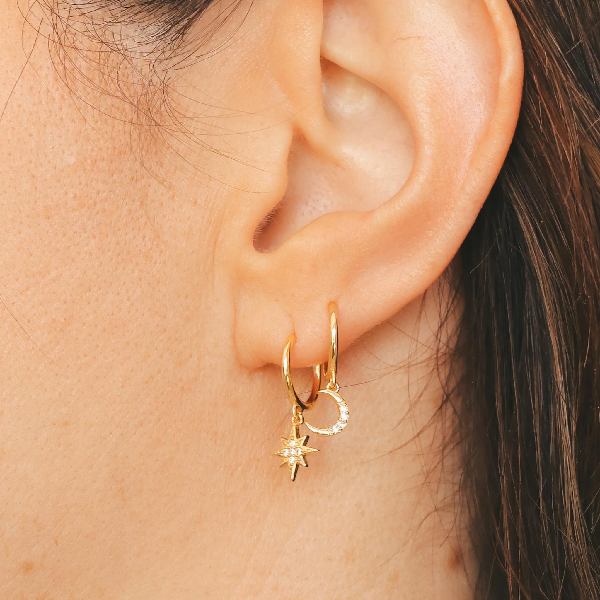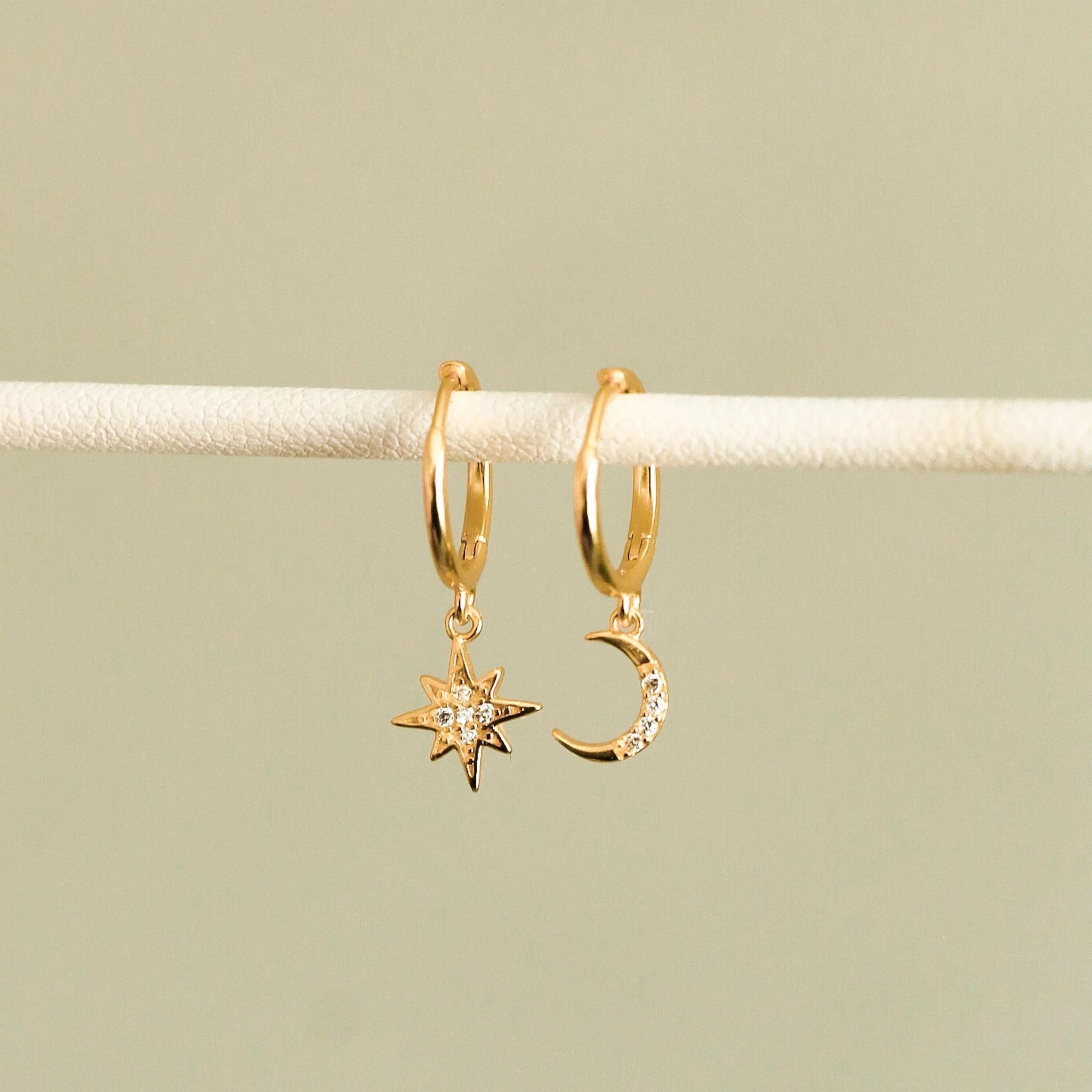 Asymmetrical charm hoop earrings featuring a moon and sun with small zircons.