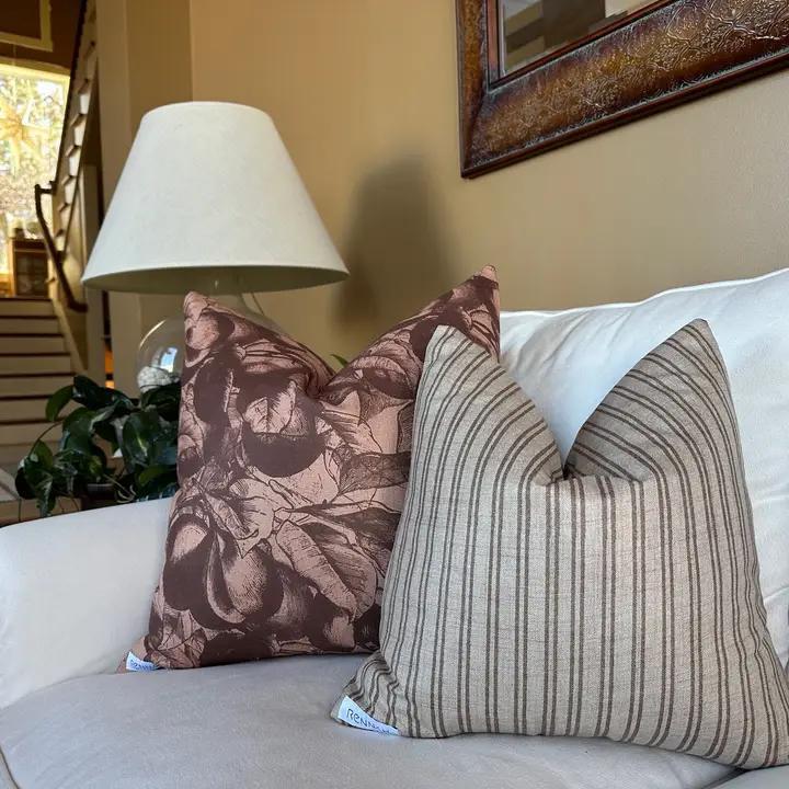 The Brown Stripe Pillow Cover will add warmth and dimension to any living space featuring a beautiful woven fabric, that is still soft to the touch. Comes in an 18x18 inch square. The fabric of the pillow cover is a polyester-linen blend, made of 85% polyester and 15% linen. It features print on both sides, has a hidden zipper, and can be machine washed. Please wash with cold water and lay flat to dry.
