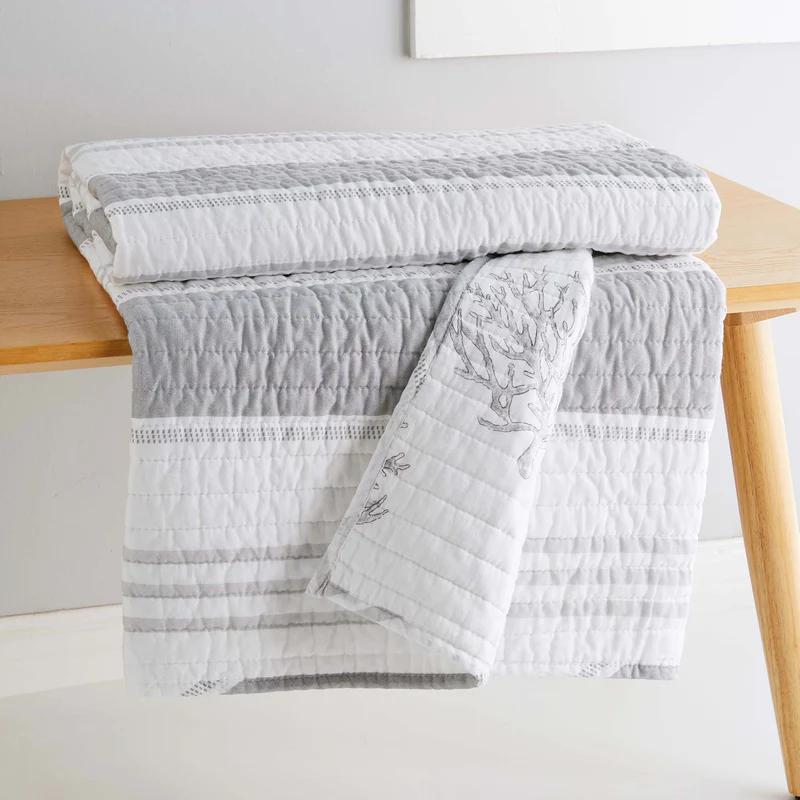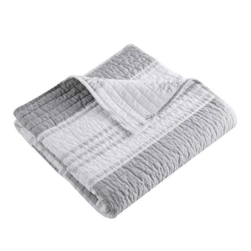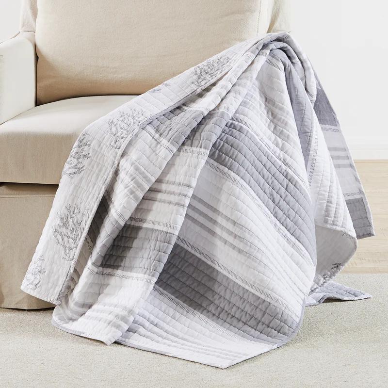 The Nantucket Reversible Quilted Throw by Levtex Home is inspired by a relaxing seaside vacation. This white and grey design will immediately transform your bedroom. Made with the softest lightweight cotton, this reversible throw features a simple stripe design in grey & white, reversing to a coral tossed in grey color on a white ground on the other. The Quilted Throw is perfectly sized at 50x60in., is machine washable and is filled with a cotton-rich filler (that includes cotton, polyester and other fibers) Enjoy this for years to come!