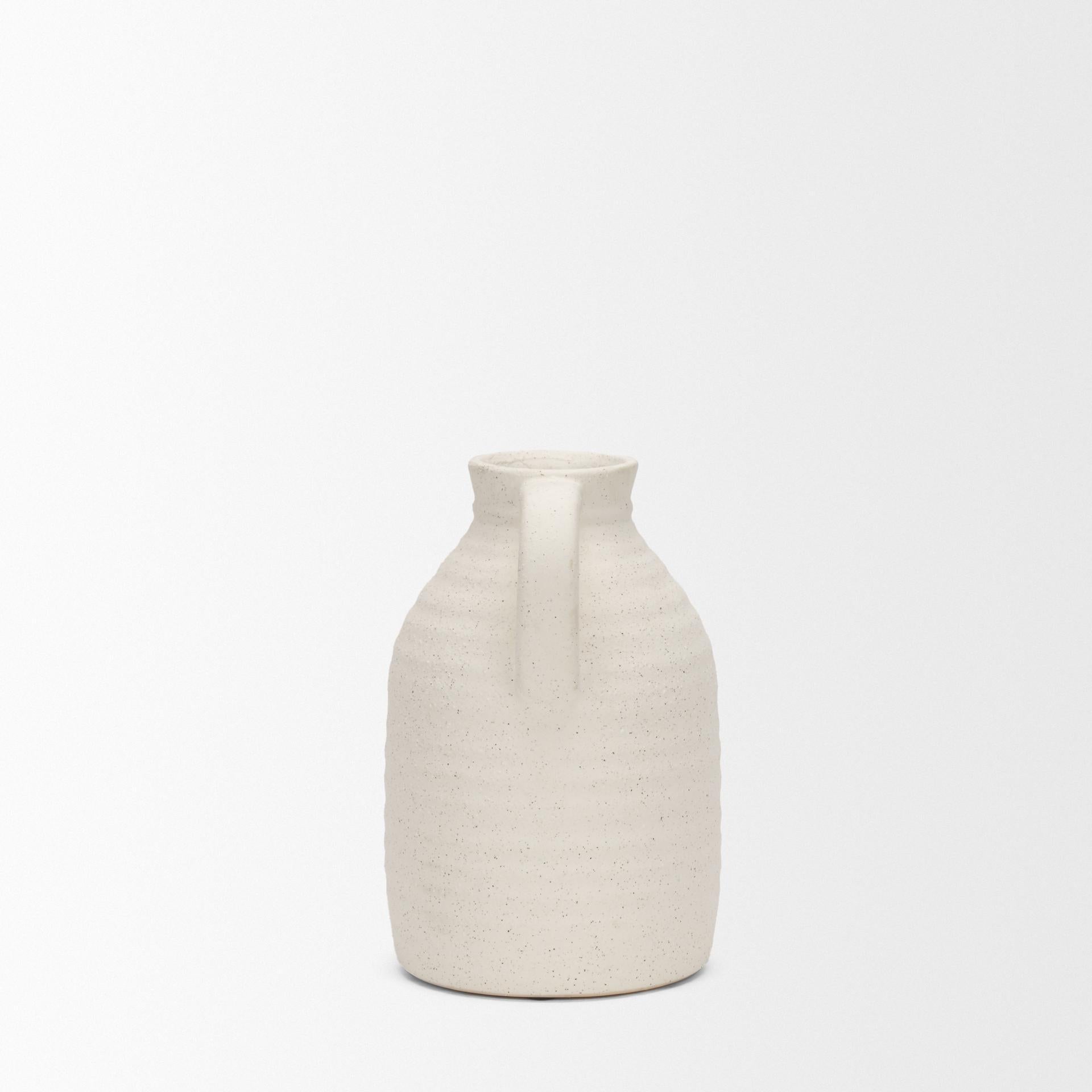 Tyrus is a matte white jug-style vase, featuring black speckling, a gritty textured finish, and rippled horizontal lines for rustic appeal.