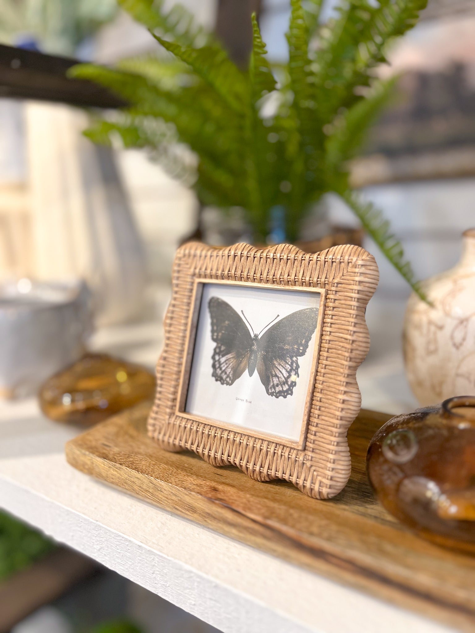 A charming butterfly print set in a small woven frame, adding soft texture and a touch of natural elegance to your décor.