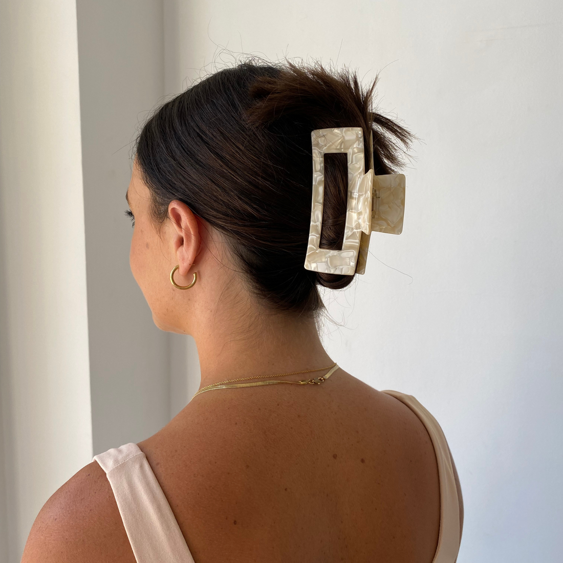 Our Crush Clip is perfectly oversized and offers strong grip in all hair types. Perfect for sleek updos, half-up styles, fresh twists, or any 90’s-inspired look.Made from eco-friendly cellulose acetate featuring a flat bottom for all-day comfort.
