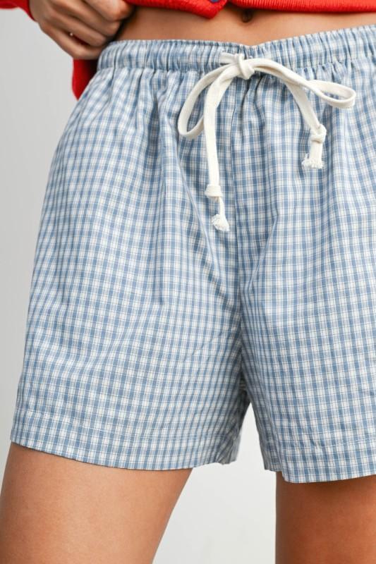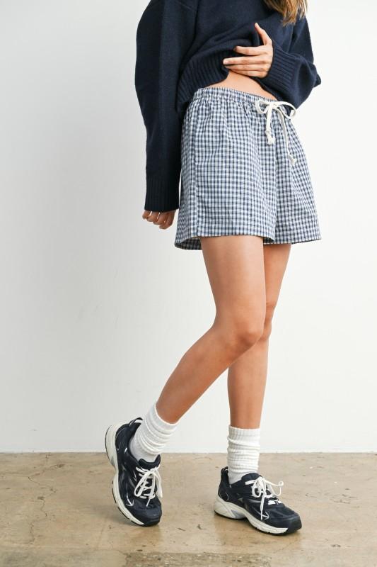 Tie-front, high-waist checker-pattern relaxed fit shorts combine playful graphic style with comfort, featuring a flattering waist tie and easy-going silhouette perfect for warm-weather days. Lined.