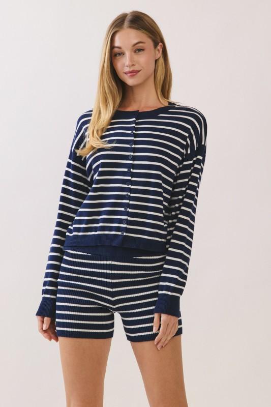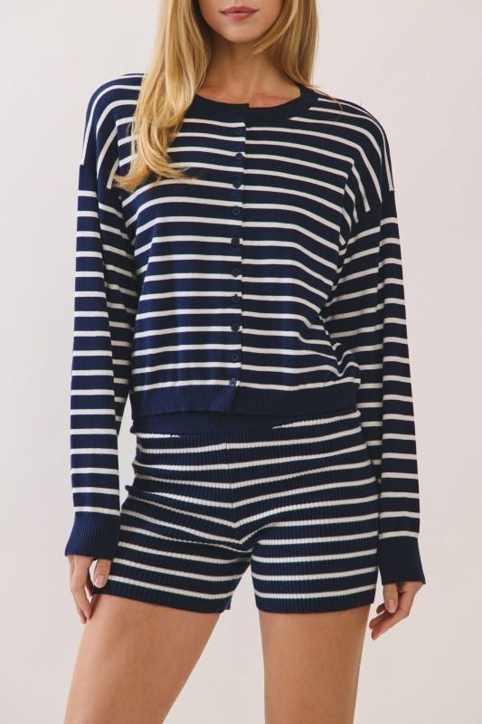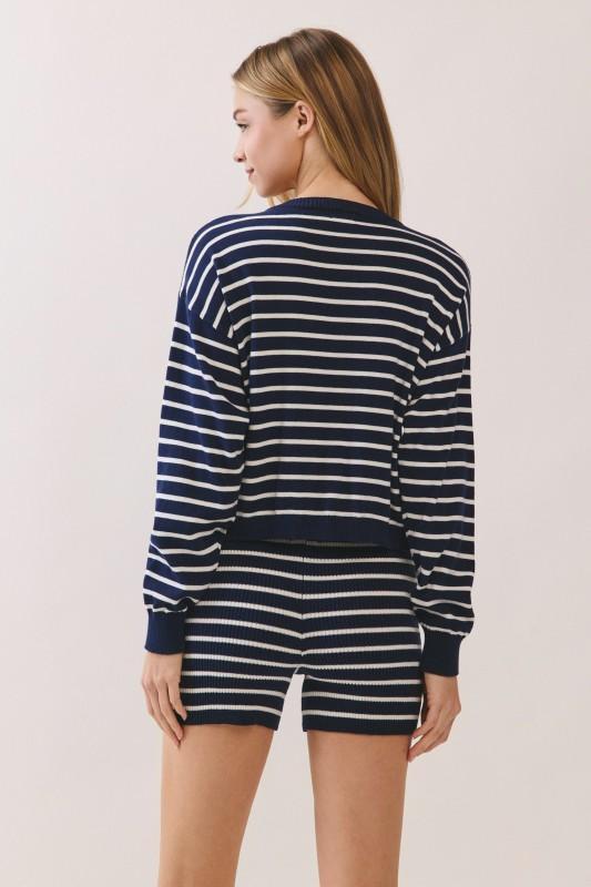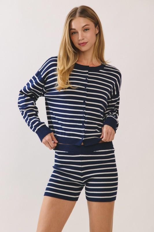 A navy striped sweater knit set offers timeless nautical-inspired style with cozy comfort and effortless coordination from top to bottom. Sweater and shorts included (sold together).